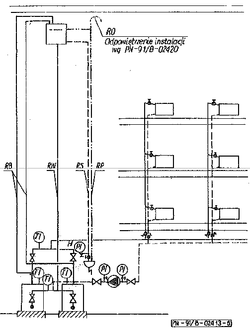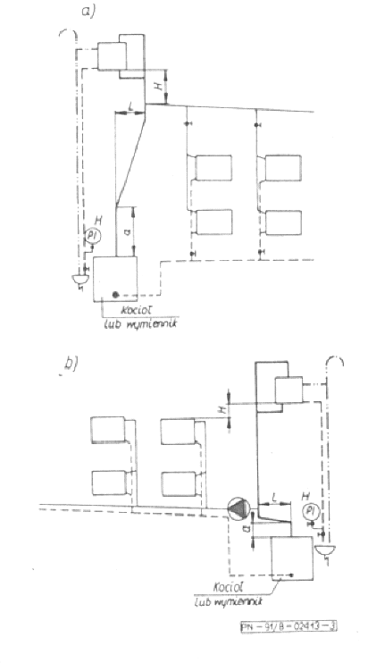 zbiorczą rurę powrotną znajdującą się bezpośrednio przy kotłach lub wymiennikach ciepła z dolną częścią przestrzeni wodnej naczynia wzbiorczego. Przy rozdziale górnym pion wznośny może spełniać rolę odcinka rury bezpieczeństwa i rury wzbiorczej. Przy rozdziale dolnym, jeżeli źródło ciepła ma moc