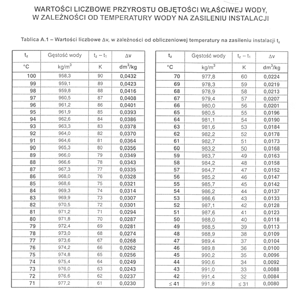 Δν – przyrost objętości właściwej wody instalacyjnej w [dm3/kg], podczas jej ogrzania od temperatury początkowej t1 do obliczeniowej temperatury wody instalacyjnej na zasilaniu tz. Wartości liczbowe Δν w funkcji temperatury na zasilaniu tz podane są w tabeli A.1 normy PN-B-02414:1999.