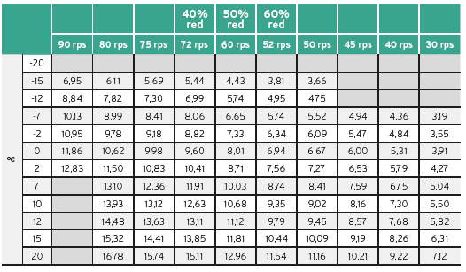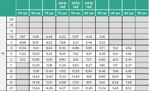 Sprawność w temperaturze 0°C wynosi 1,9-2,0 w zależności od obrotów. Dostępna moc 8,8kW dla obrotów 70/sek: