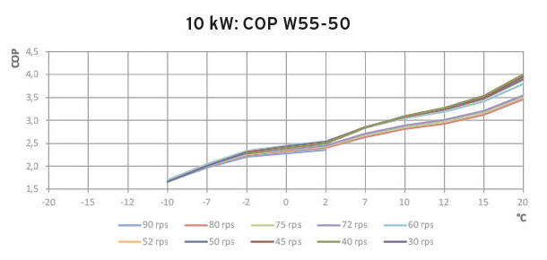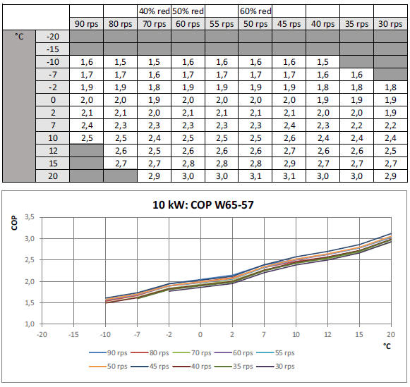 Co w przypadku wyższej temperatury rzędu 65°C? Pompa ciepła w tych warunkach nie jest w stanie pracować. Może podnieść temperaturę wody do maksymalnie +55°C, resztę musi zapewnić grzałka elektryczna. Przy temp. +55°C pompa ma sprawność jeszcze około 2,37 dla podobnych obrotów rzędu 72/sek.