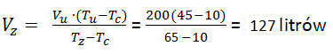 Dla temperatury w zasobniku +45°C użyteczna ilość ciepłej wody wyniesie dokładnie 200 litrów dla zasobnika o tej samej pojemności. Jeśli podniesiemy temperaturę zadaną do +65°C wymagana pojemność zasobnika spadnie i wyniesie: