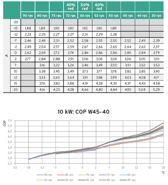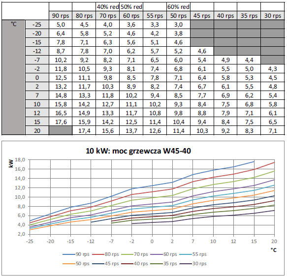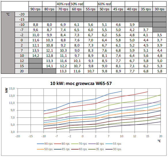 Dla tych samych parametrów pracy moc grzewcza pompy wyniesie jednocześnie 9,8kW.