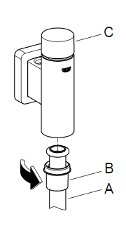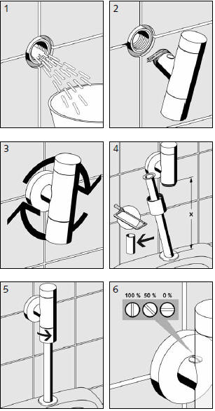 Kolejna ważną czynnością jest wstępne przepłukanie pisuaru, aby pozbyć sie ewentualnych zanieczyszczeń w instalacji. Czas przepłukania powinien wynosić około 30 s. Po przepłukaniu zakręcamy zawór odcinający i demontujemy rurkę pionową. Kolejne czynności pokazują rysunki.