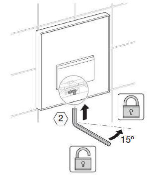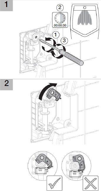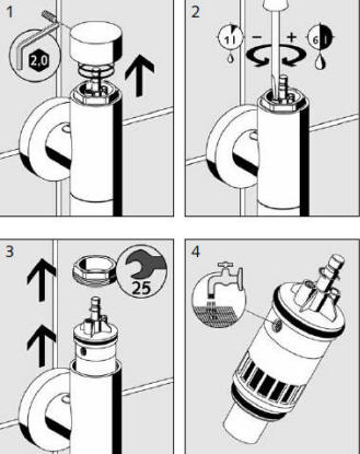 Podobnie jak w poprzednim wypadku po przepłukaniu instalacji podwijamy gwint korpusu i wkręcamy (ręką) zawór w ścianę. następnie mierzymy odległość między korpusem a pisuarem i ucinamy rurkę pionową tak aby jej długość „X” była większa o 20mm. na czas serwisu odcinamy wodę przekręcając śrubę na korpusie równolegle do ściany. Sewis wewnętrzny zaworu wymaga w pierwszej kolejności zdjęcia przycisku. Odkręcamy go kluczem imbusowym nr 2, uważając aby nie zgubić sprężyny powrotnej. Regulacja czasu odbywa się wkrętakiem przez jego obrót w lewo lub prawo. Położenia skrajne zapewniają minimalny lub maksymalny przepływ.
