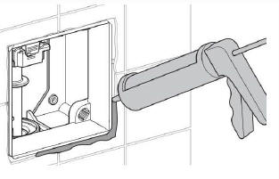 Montaż zaworu rozpoczyna się tradycyjnie od usunięcia puszki dystansowej i zasylikonowania szczeliny między puszką a ścianą.
