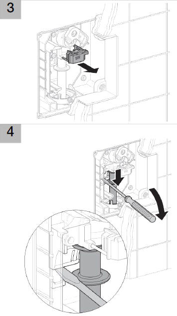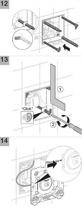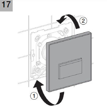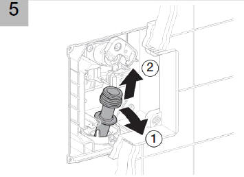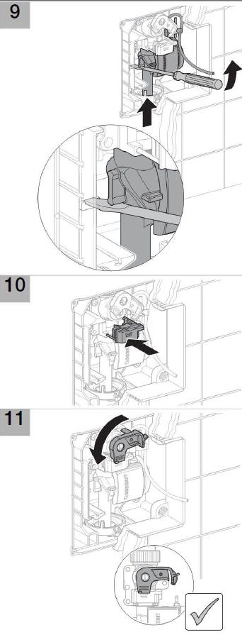 Po zamocowaniu korpusu i przekręceniu blokady (rys.11) przystępujemy do montażu płytki spustowej. W pierwszej kolejności montujemy jest podstawę, do której będzie zamocowany wężyk. Podstawa wymaga zamontowania w puszce przyłączeniowej czterech kołków tworzywowych. Mocujemy je przez zakliknięcie uprzednio skracając na odpowiednią długość. Kołki posłużą nam za punkty montażowe czterech wkrętów.