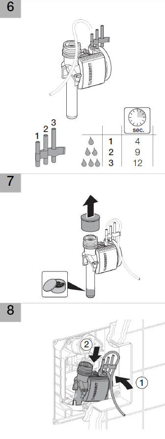 Teraz najważniejsza z punktu użytkownika czynność, ustawienie ilości spłukiwanej wody. Do korpusu zaworu dostarczone są trzy dysze o różnej długości. najkrótsza dysza daje jednocześnie najkrótszy czas spłukiwania, tym samym najmniejsze zużycie wody. Jeśli wybierzemy tę dyszę spłukiwanie będzie trwało około 4 sekundy i wyniesie 1 litr. pozostałe dysze i czasy spłukiwania pokazuje rysunek. Zadaniem montera jest założenie na wężyk odpowiedniej dyszy i umieszczenie jej w korpusie zaworu pneumatycznego. Drugi koniec wężyka będzie podłączony do płytki spustowej. Jeśli ilość spłukiwanej wody nie będzie dla nas satysfakcjonującą, zawsze możemy wymienić dyszę. Czynności na kolejnych rysunkach.