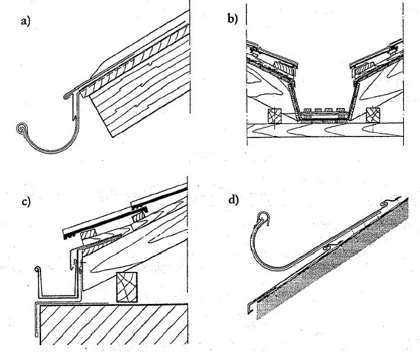 Rys. Rodzaje rynien. a) okapowa, b) koszowa, c) gzymsowa, d) leżąca