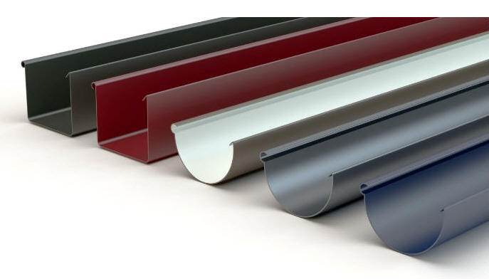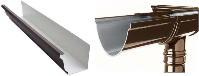 Fot. Różne kształty rynien. U góry prostokątne i półokrągłe. U dołu po lewej – gzymsowa asymetryczna, po prawej – półeliptyczna.