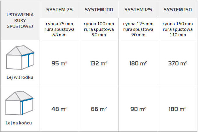 Systemy rynnowe produkowane są o różnych przekrojach, które decydują o maksymalnej powierzchni odwadnianego dachu. Ten ostatni parametr zależy nie tylko od przekroju rynny, ale też od usytuowania pionu spustowego. Pion (lej spustowy) może być położony na końcu dachu (w narożniku budynku), jak i na jego środku.