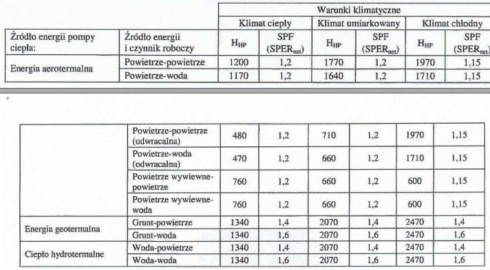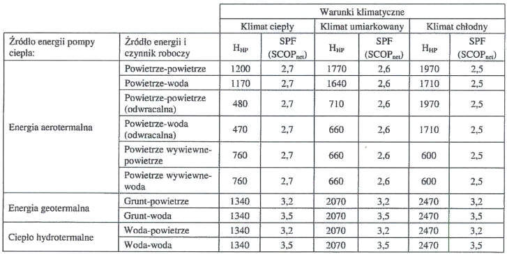 Tabela. Ilości godzin równoważnej pracy Hhp i SCOP dla pomp ciepła elektrycznych
