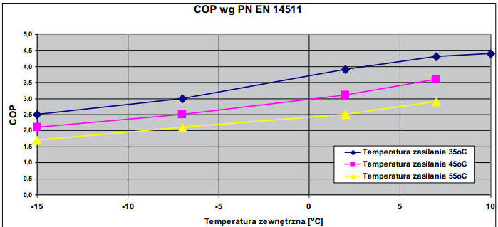 Współczynnik COP nawet dla tej samej pompy mogą się znacznie różnic jeśli pod uwagę weźmiemy inna temperaturę dolnego i górnego źródła ciepła. Na poniższym wykresie pokazano jak zmienia się ten wskaźnik dla wybranej pompy przy zmianie temperatury powietrza zewnętrznego od -15 do +10°C. Jej producent może więc zachwalać dany model obiecując wskaźnik COP na poziomie 4,5, jednak wartość taka jest osiągalna tylko przy niskiej temperaturze wody zasilającej instalację i temperaturze zewnętrznej ≥10°C. Przy temperaturze 55°C i spadku temp. zewnętrznej poniżej 0°C, współczynnik COP pompy nie przekroczy 2,5.