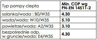 Minimalne wymagane wartości COP określa norma PN 14511 (tabela)